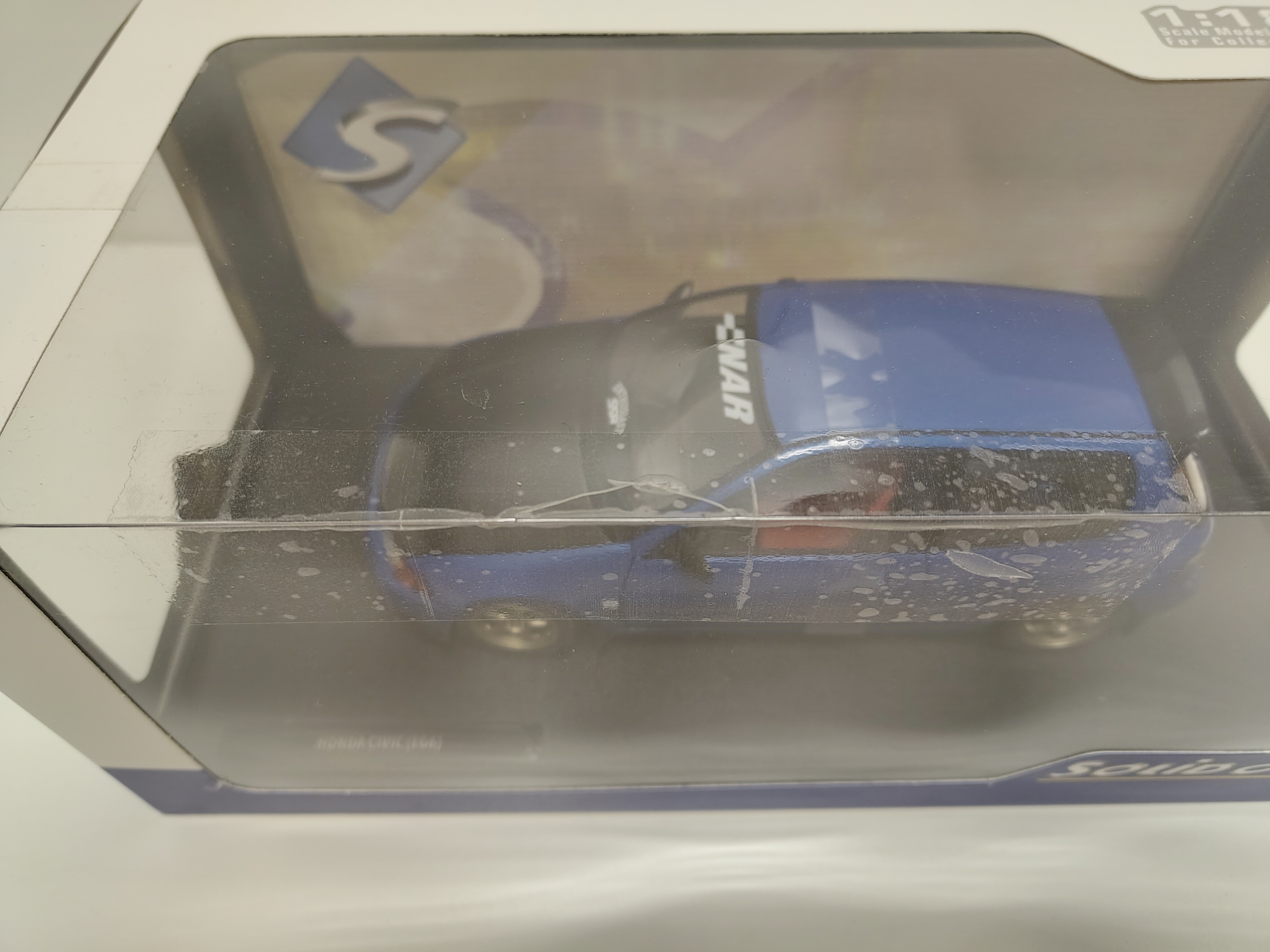 With a crack in the plastic of the box, which has been fixed with tape. See last photo.